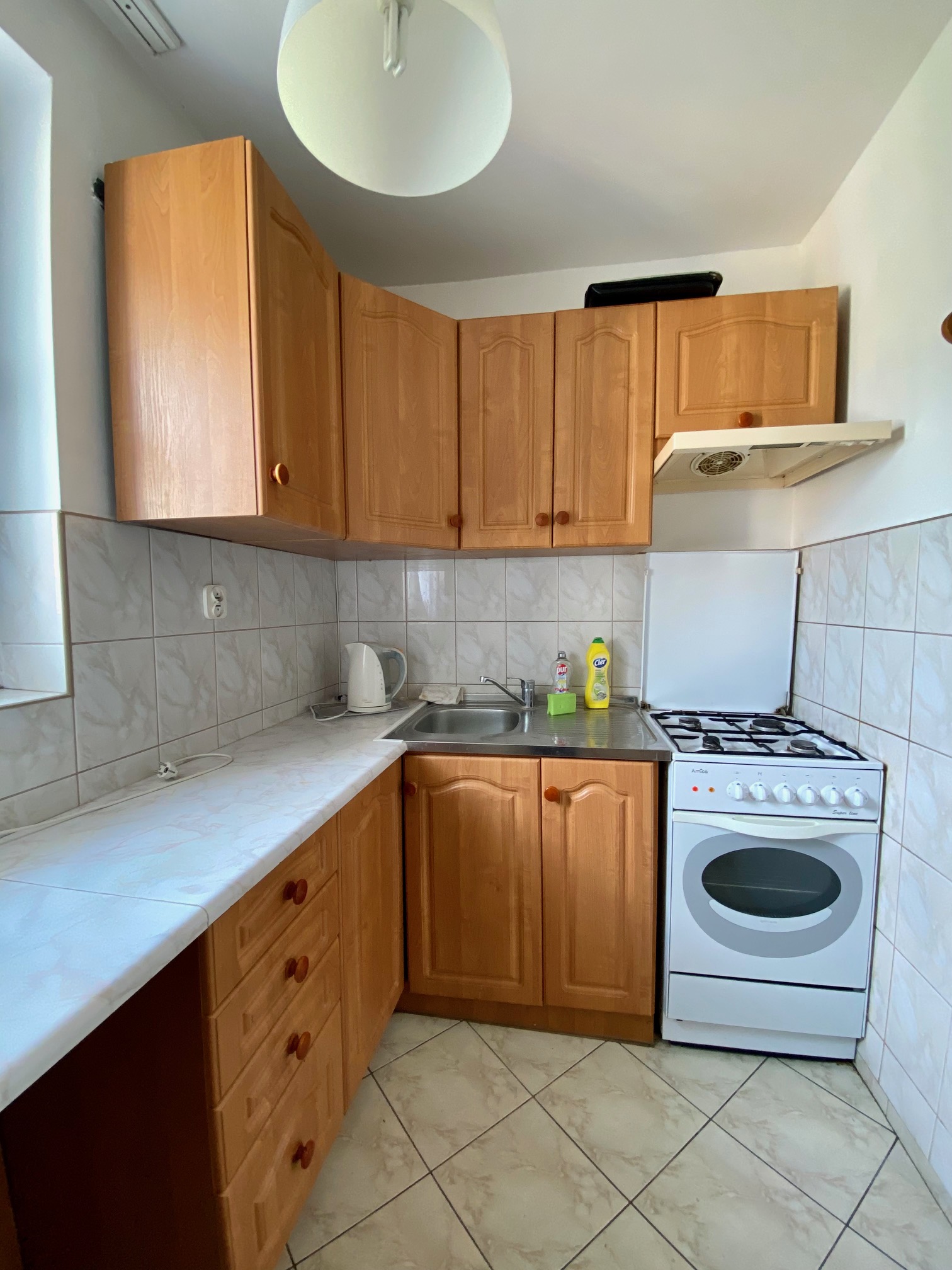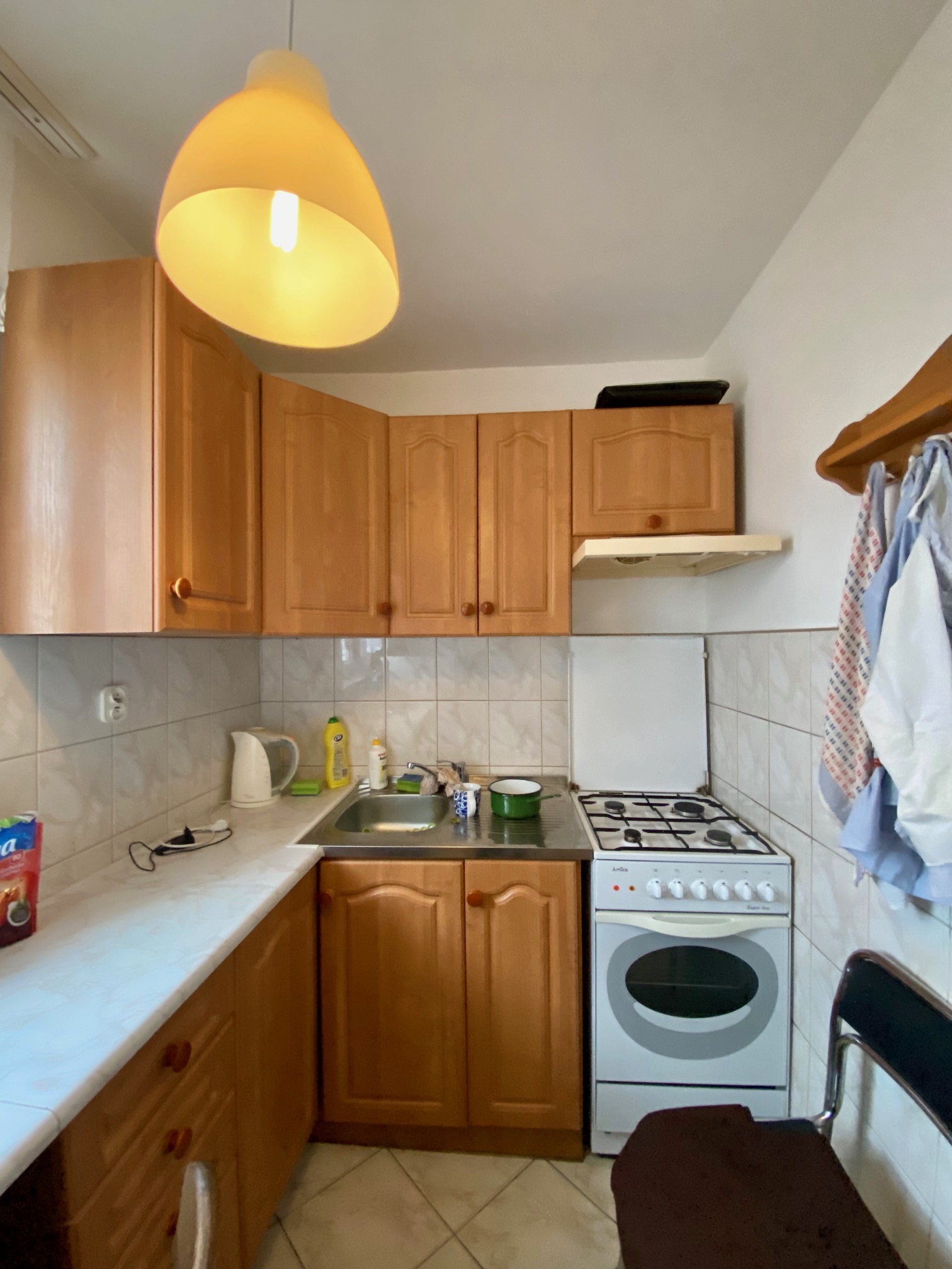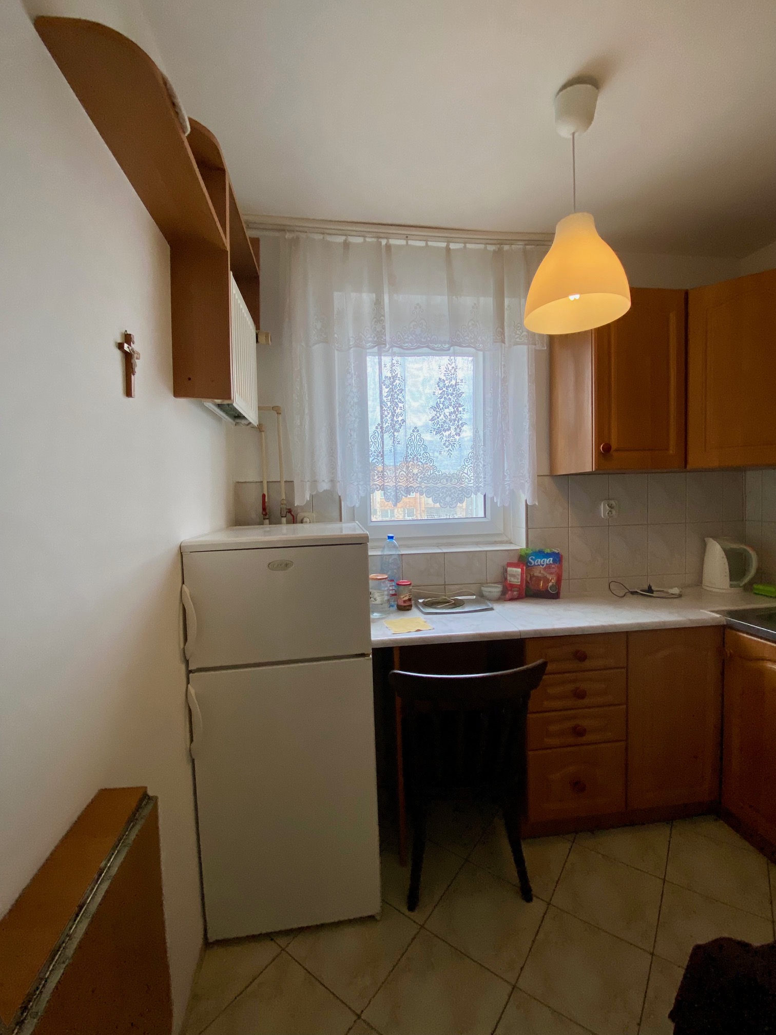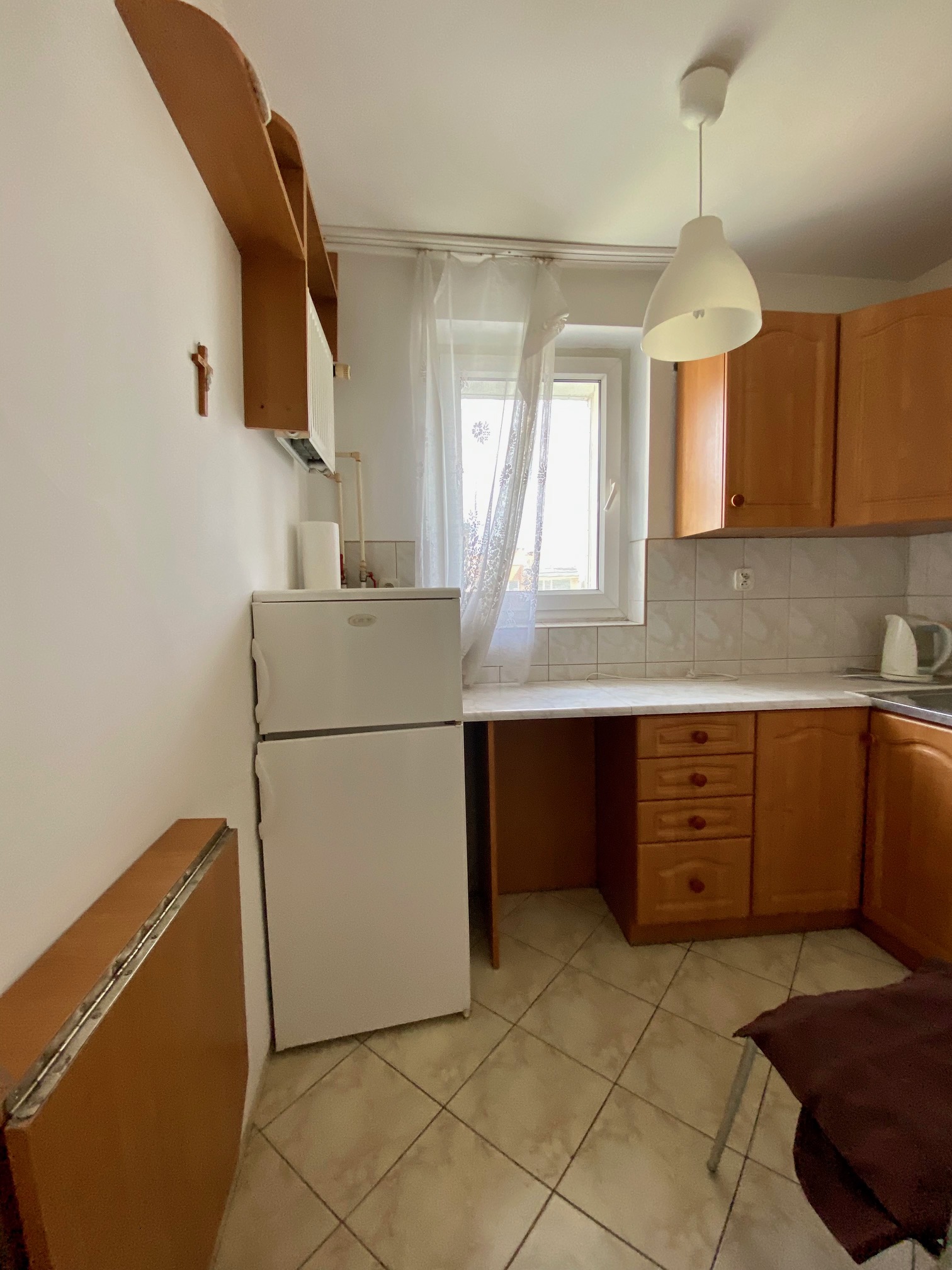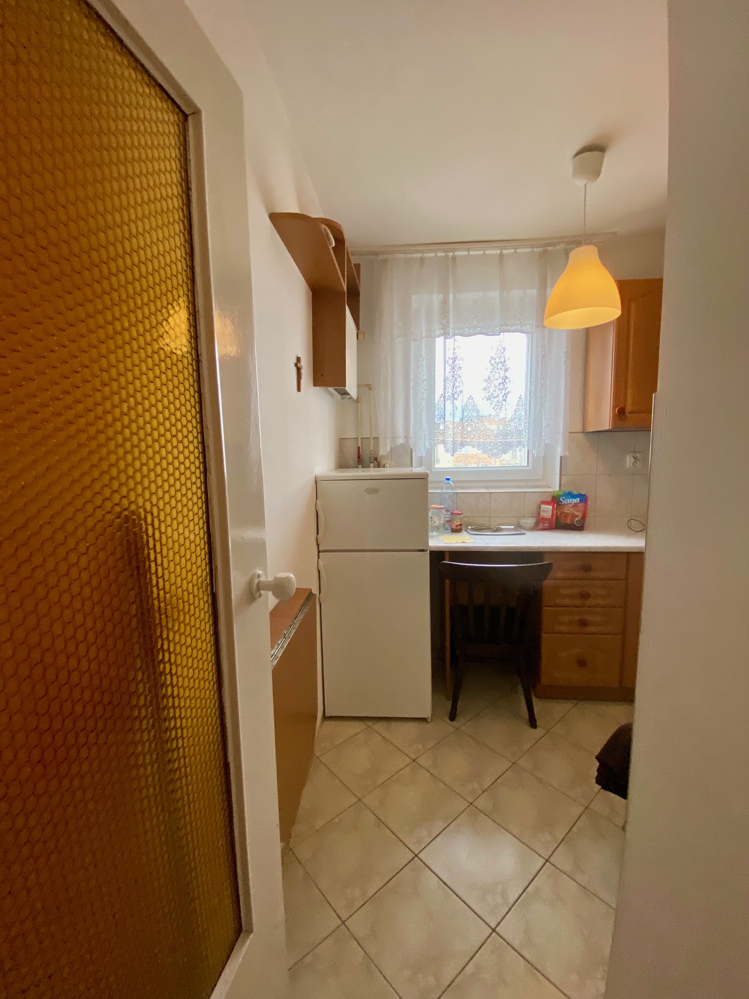 Kawalerka o powierzchni 35 m2 składająca się z pokoju w kształcie prostokąta z rozmieszczeniem okien pozwalającym na zrobienie dwóch małych pokoi w pełnym rozkładzie, malutkiej kuchni z oknem, łazienki z małą wanną i przedpokoju. Do mieszkania przynależy piwnica.
